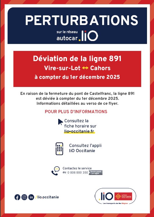 Nous vous informons que la nouvelle organisation de la ligne 891 Vire-sur-Lot ↔ Cahors, liée à la fermeture du pont de Castelfranc, sera mise en œuvre à compter du 1er décembre 2025.