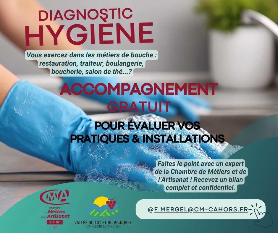 La Chambre de Métiers et de l’Artisanat du Lot, en partenariat avec la Communauté de Communes, propose une étude de diagnostic hygiène aux professionnels de la restauration & de l’alimentation (production et transformation) du territoire, pour faire le point sur vos pratiques et installations. Les contrôles spontanés de la Direction de l’emploi, du travail, des solidarités et de la protection des populations (DDETSPP) étant en forte hausse dans le département, soyez bien préparés et conformes à la réglementation à travers ce bilan complet et confidentiel.