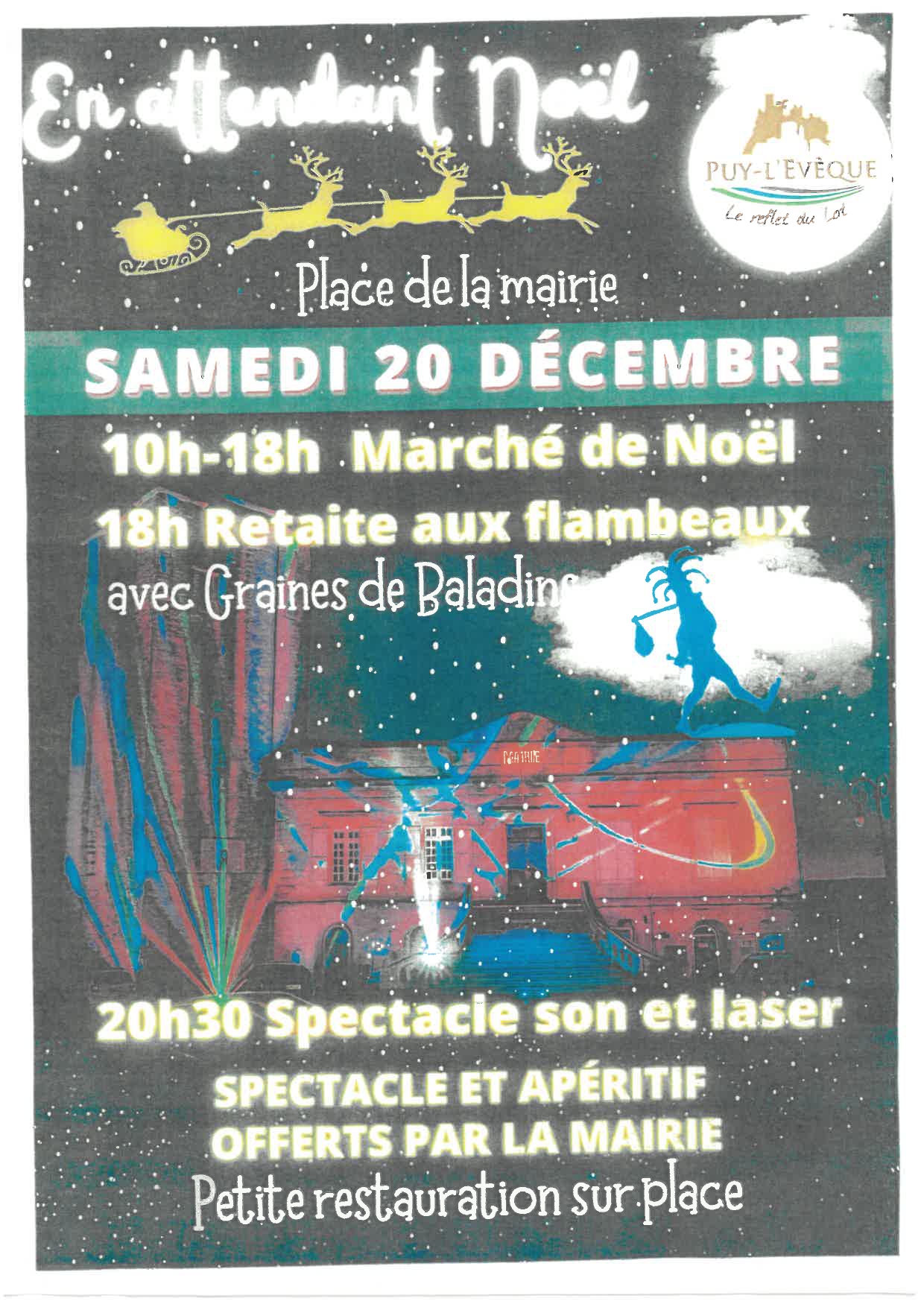 Le marché de Noël aura lieu sur la place de la mairie avec retraite aux flambeaux contée suivi d'un spectacle son et laser.